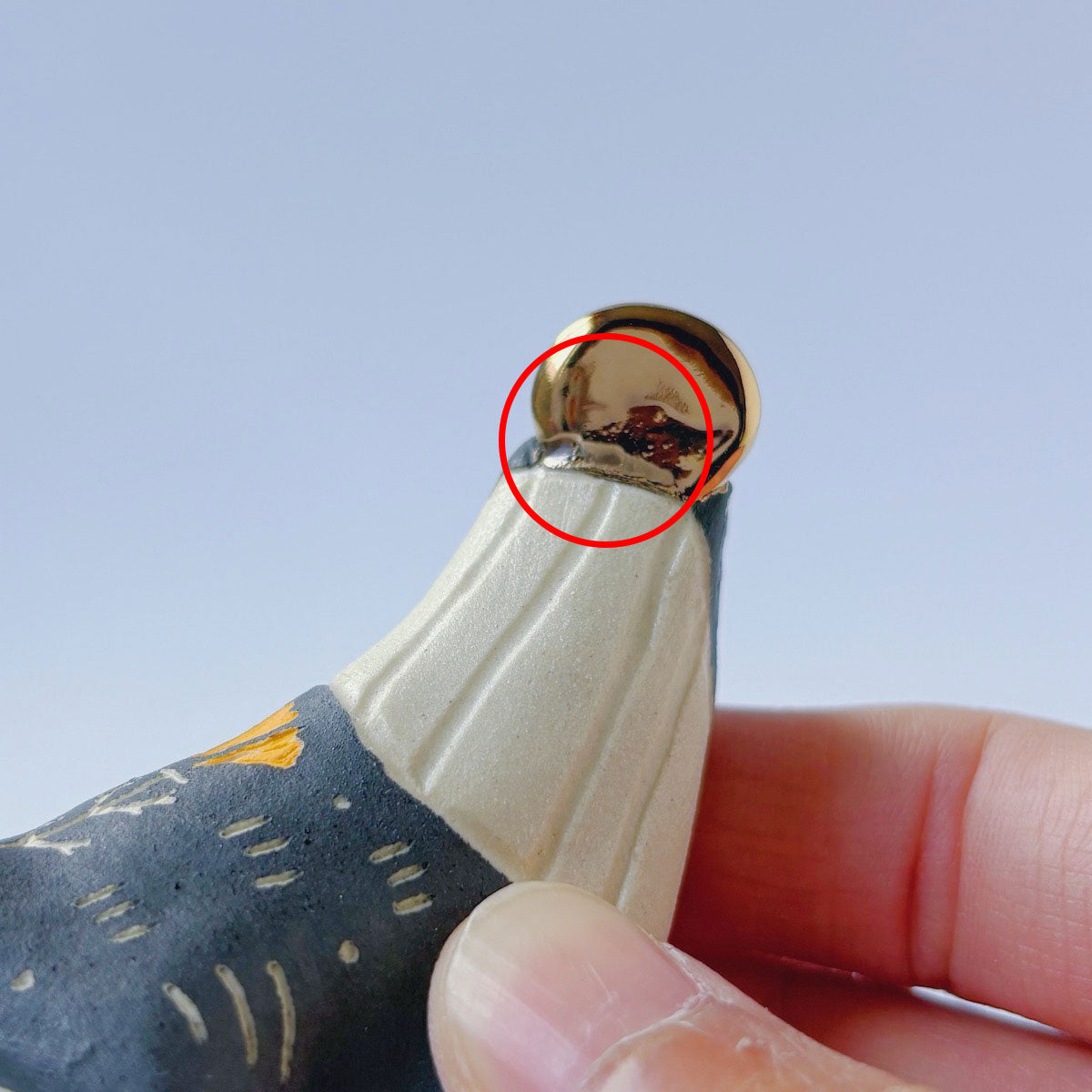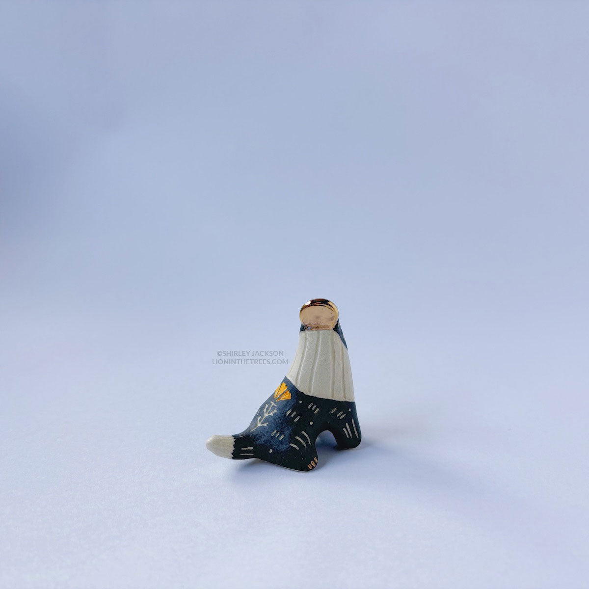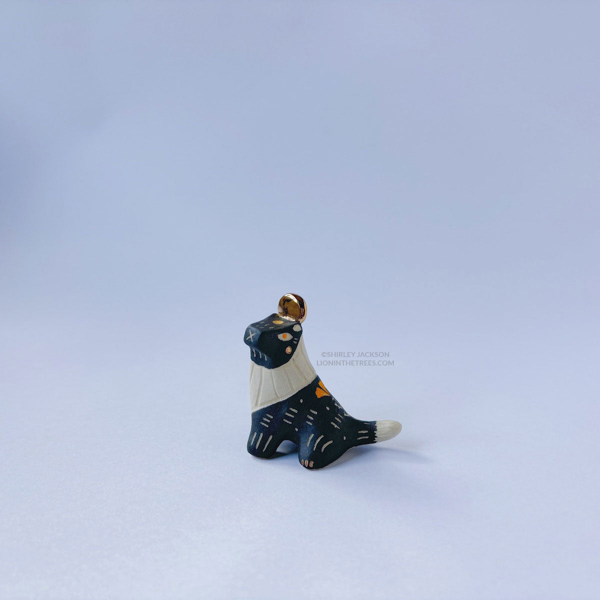 Lion totem done with underglaze, gold luster.