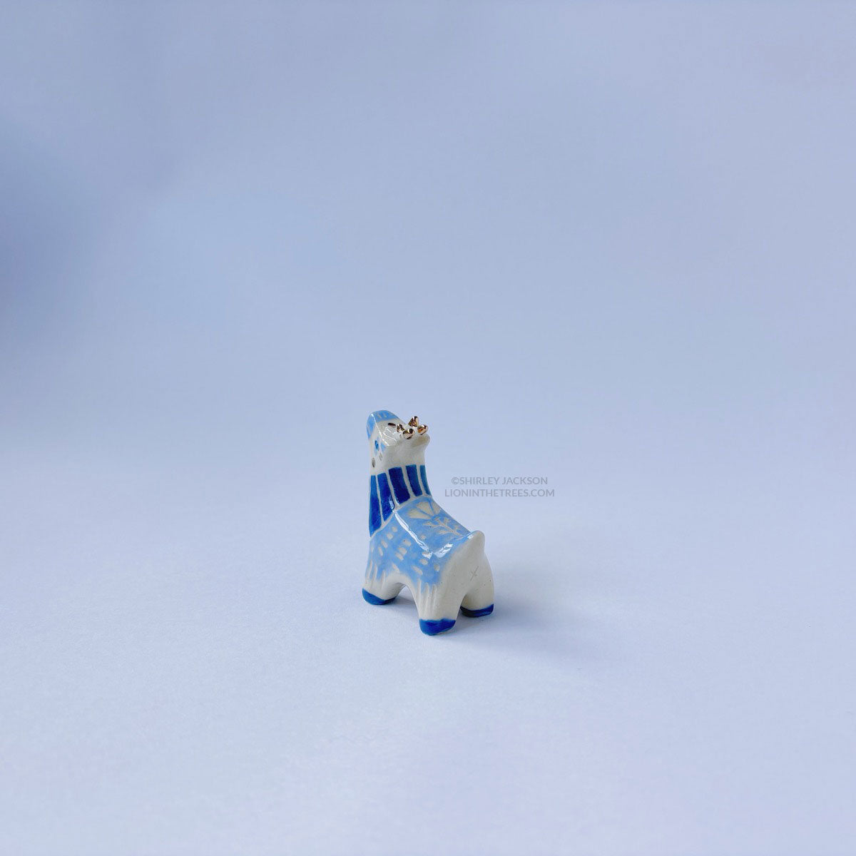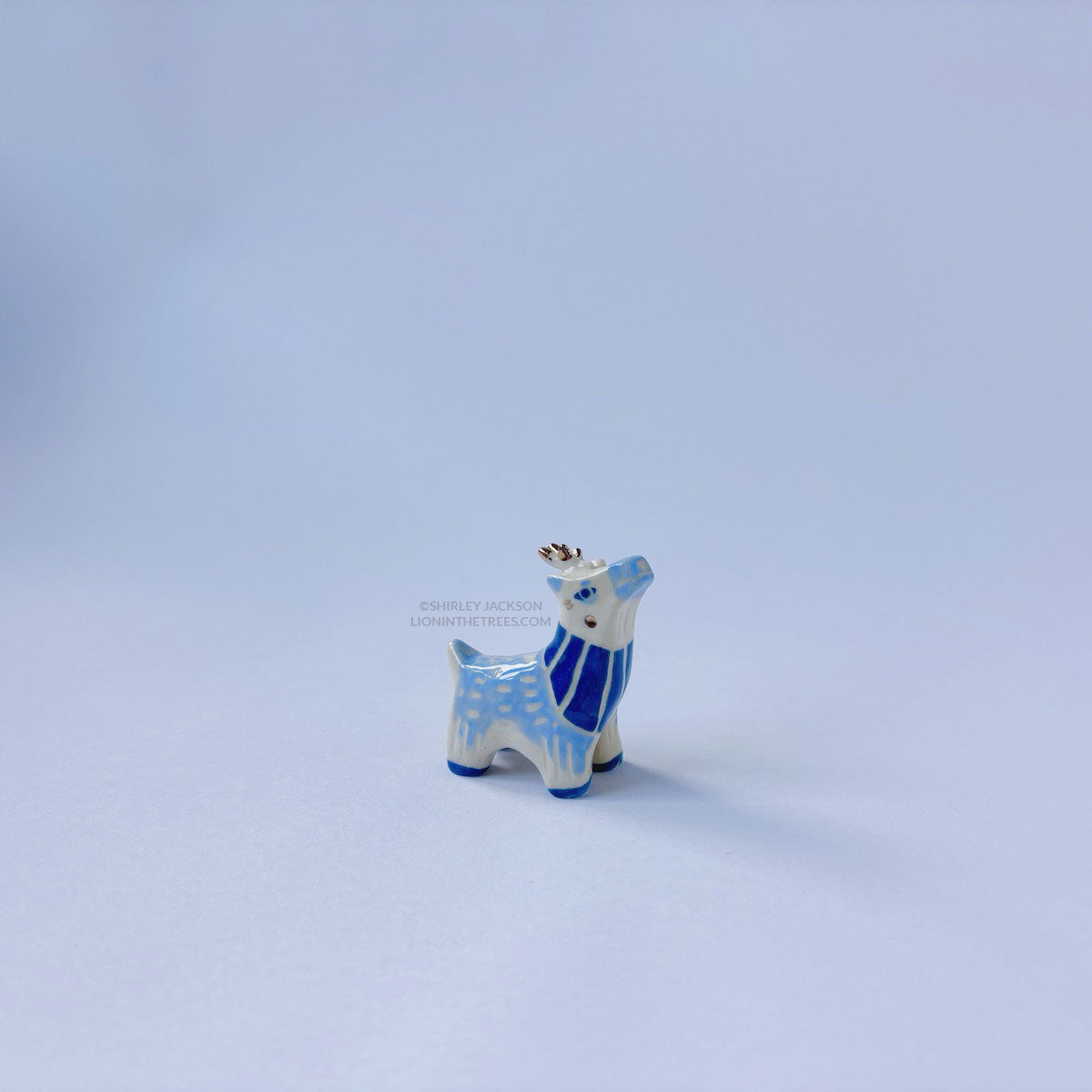 Blue elk totem done with underglaze, clear glaze, gold luster.